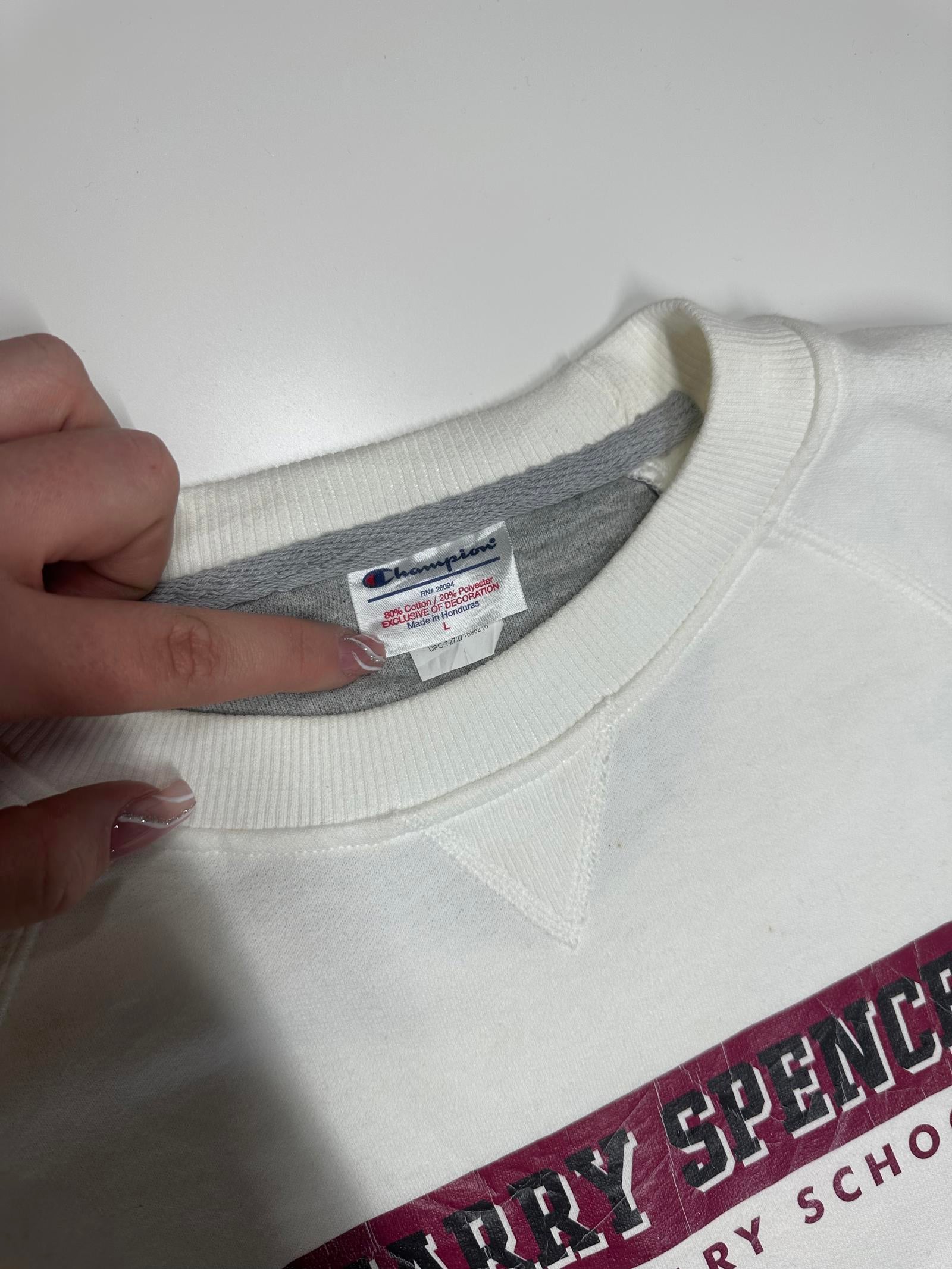 Add a touch of nostalgia to your wardrobe with this vintage Champion sweatshirt, featuring bold Harry Spencer Elementary School lettering across the chest. A true retro piece that blends heritage, comfort, and timeless collegiate style.